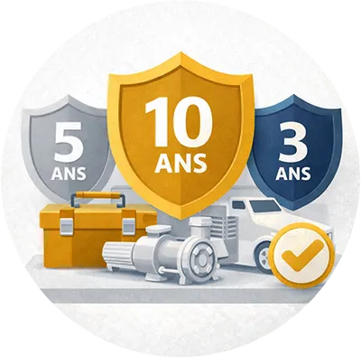 Coque garantie 10 ans, structure 5 ans, pompes et électronique 3 ans, pièces, main-d’œuvre et déplacements inclus.