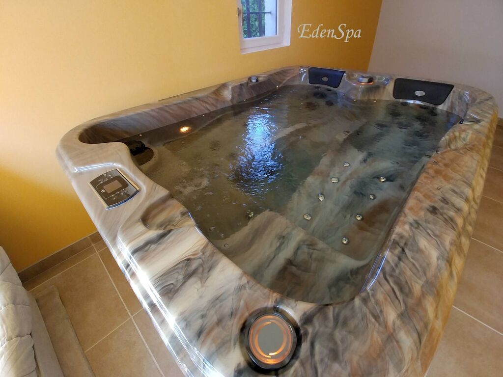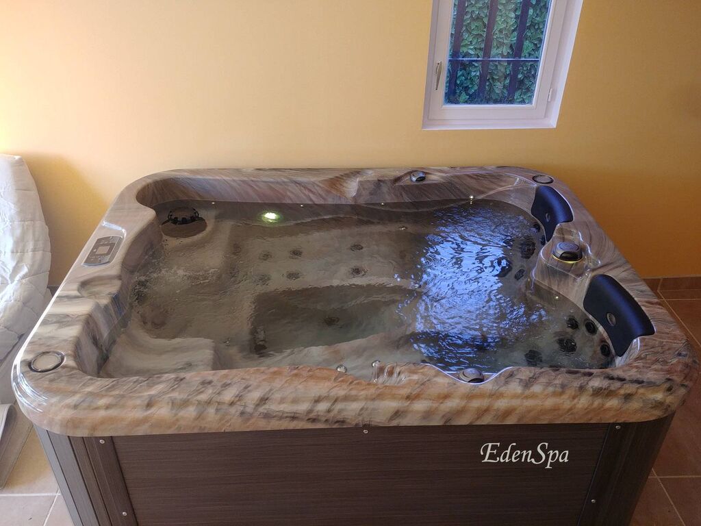 C'est à Cadolive dans les Bouches-du-Rhone que nous avons installé: un spa 3 places, 2 allongées et 1 assise, équipé de 47 jets, d'une pompe de massage et d'une pompe à air (blower). Ce spa, le O347, est également équipé d'un clavier couleur k800 et d'un système Gecko in.clear. Le principe: grâce à un électrolyseur au sel de brome, le système génère automatiquement du brome libre, un puissant désinfectant. Après quelques heures, le brome se recombine en sel de brome.