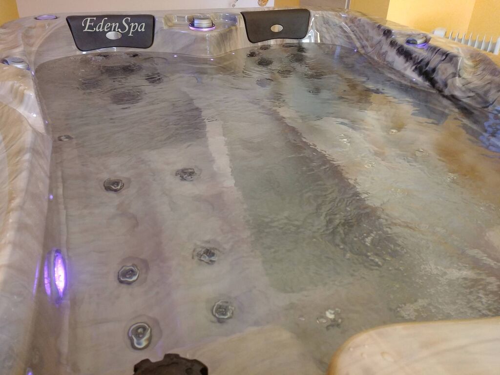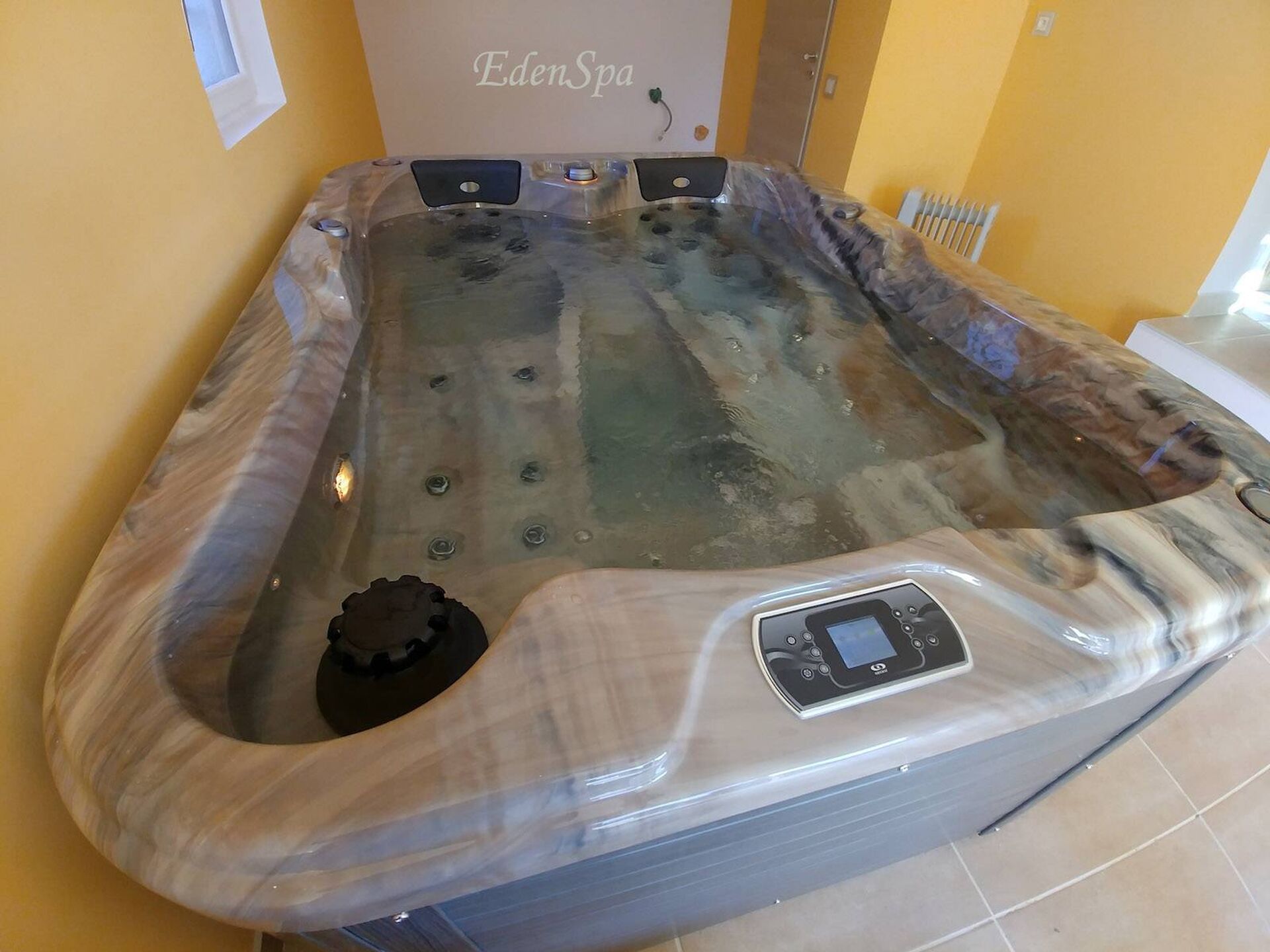 Le spa a pris place dans une véranda. Ne faisant que 1,65m sur le chant, nous l'avons fait passé par une baie vitrée et installée dans une pièce de bien-être dans laquelle prendra place une banquette et du matériel de sport.