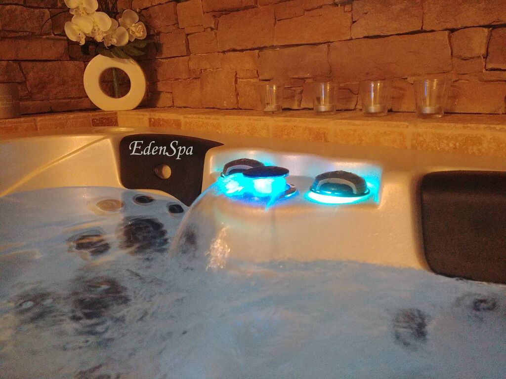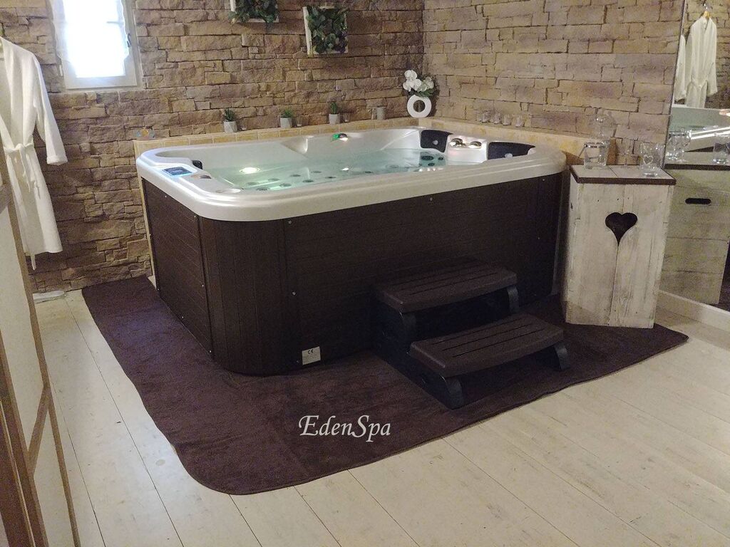 L'habillage du spa, Mohagany, se marie à merveille avec les couleurs chaudes de la pièce.