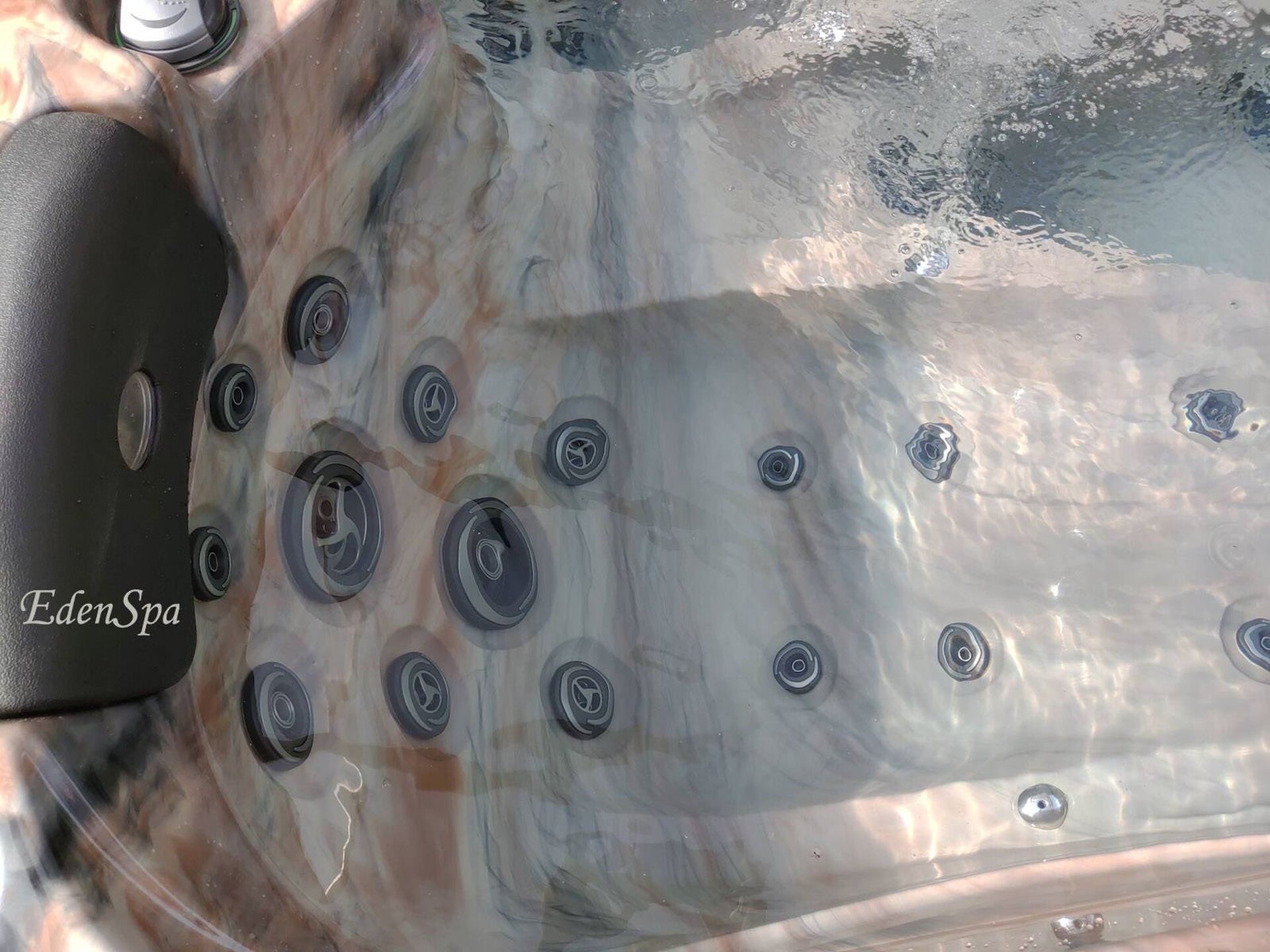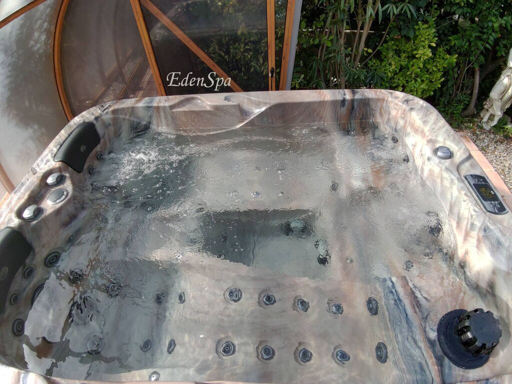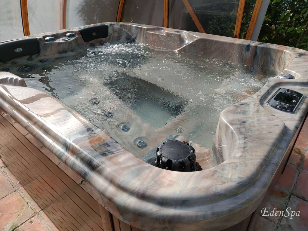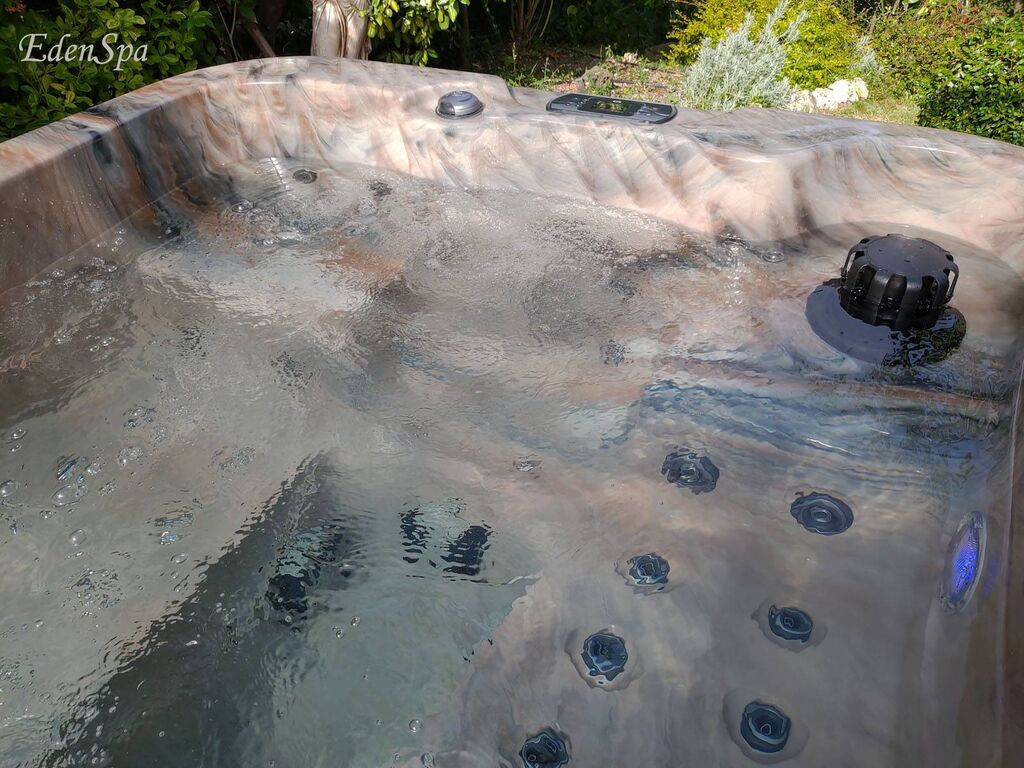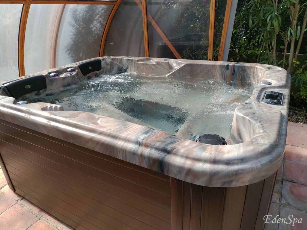 Le spa est aujourd'hui livré dans sa finition Tuscan Sun, un beige marbré particulièrement classe. L'habillage est couleur mohagany, une marron chocolat parfaitement coordonné à la couleur de la coque.