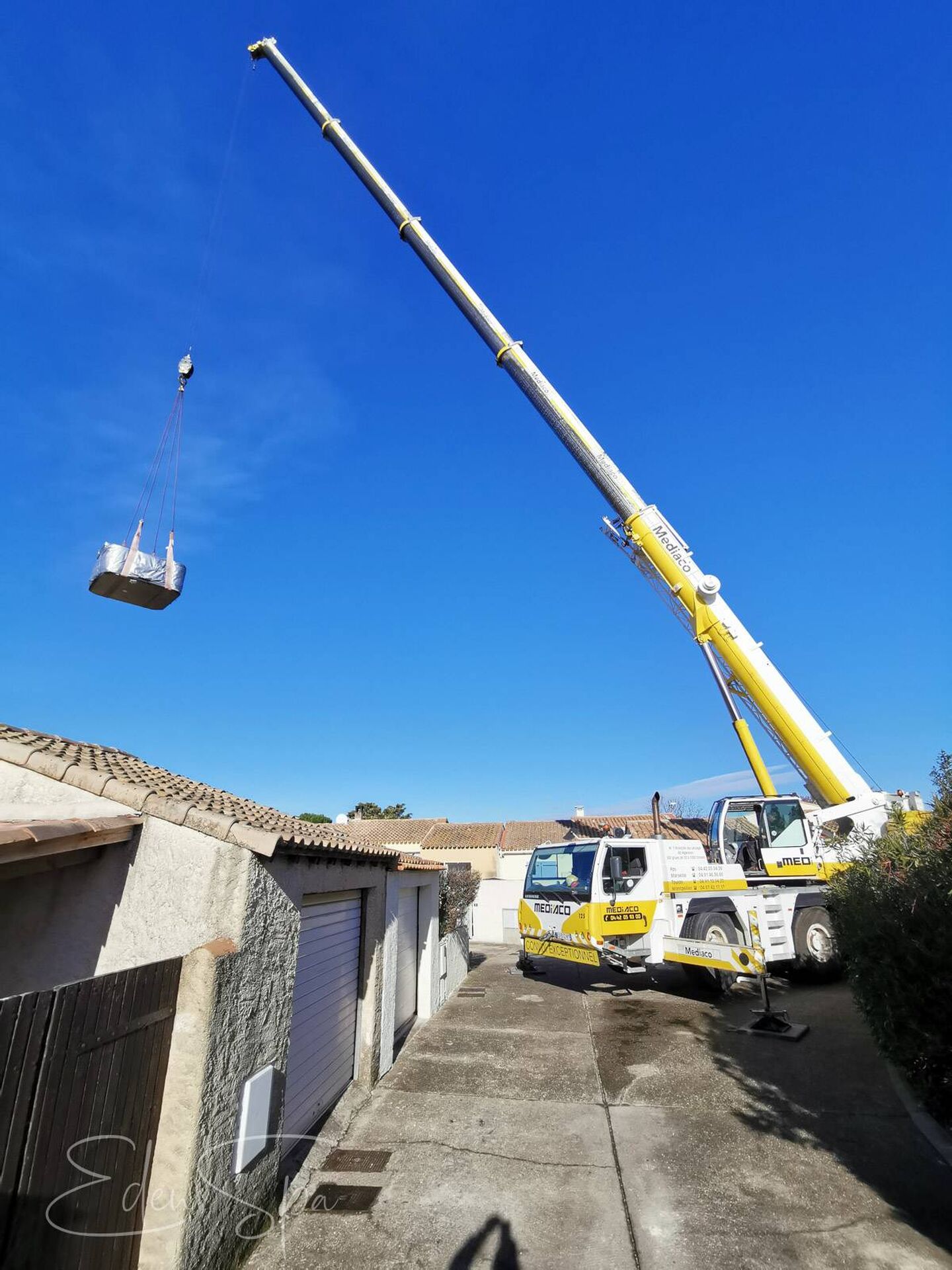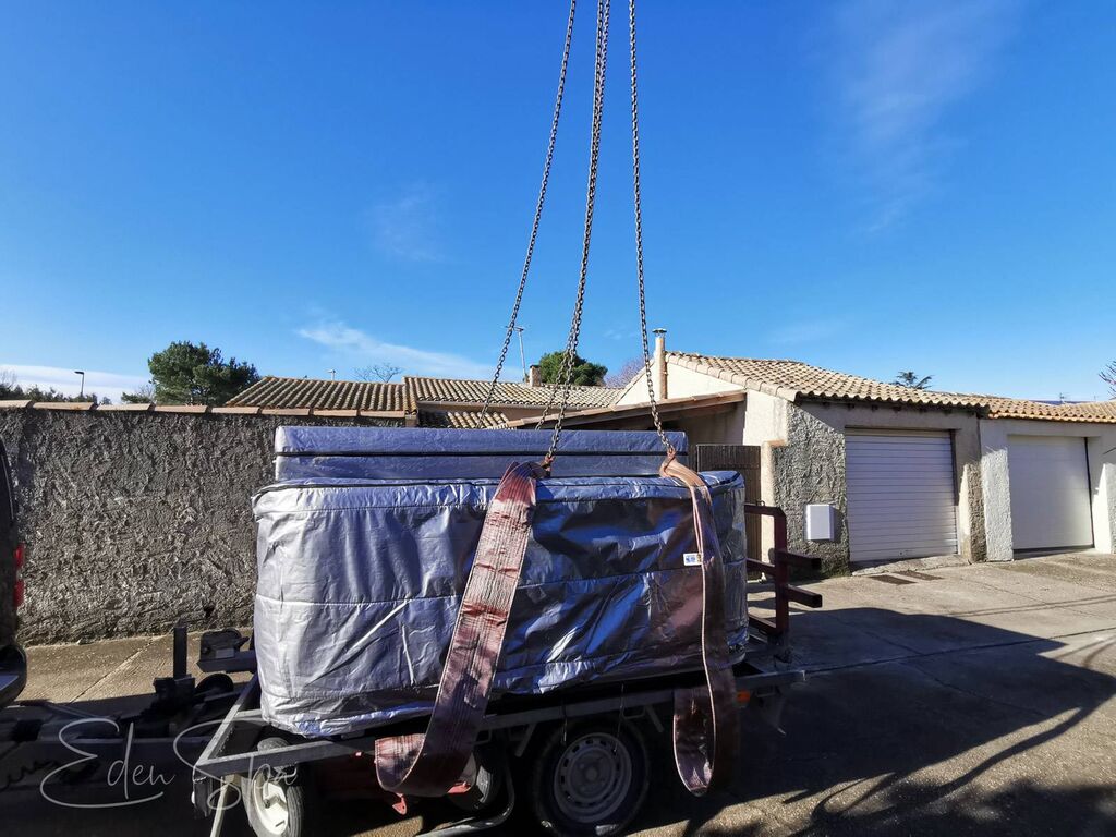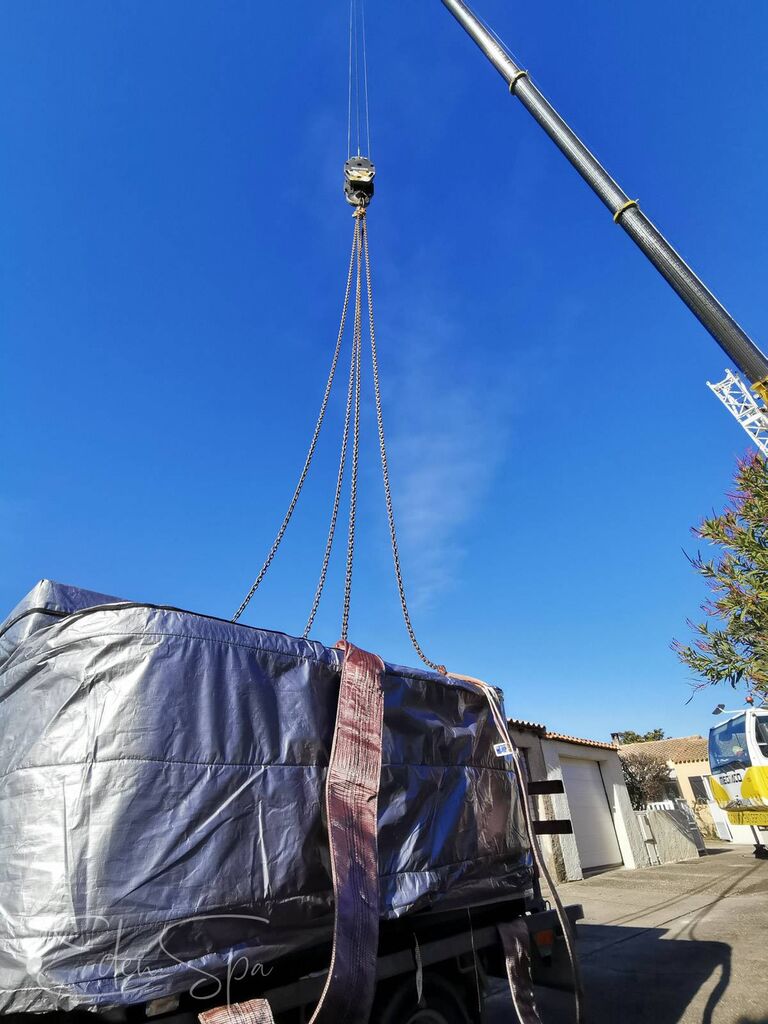 Pour installer ce spa de luxe, il a été nécessaire de faire appel à une grue de grande envergure pour effectuer la manutention, les accès étant très limités.