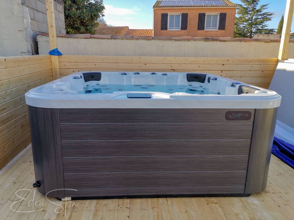 Le spa a été installé sur une terrasse en bois à Saint-Martin-de-Crau, qui sera bientôt surmontée d'un abri type chalet avec une grande baie vitrée.