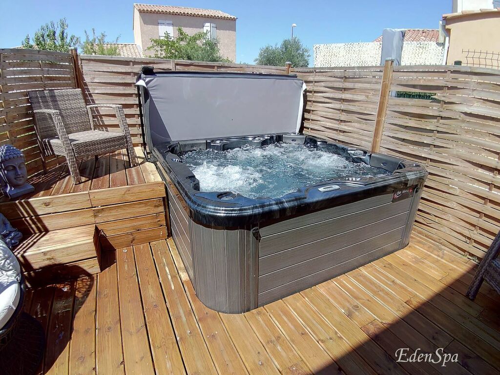 Le spa prend place sur une terrasse en bois que nous avons découpée pour que le spa s'intègre parfaitement. Quelques marches et une plateforme permettent de faciliter l'accès pour les enfants.