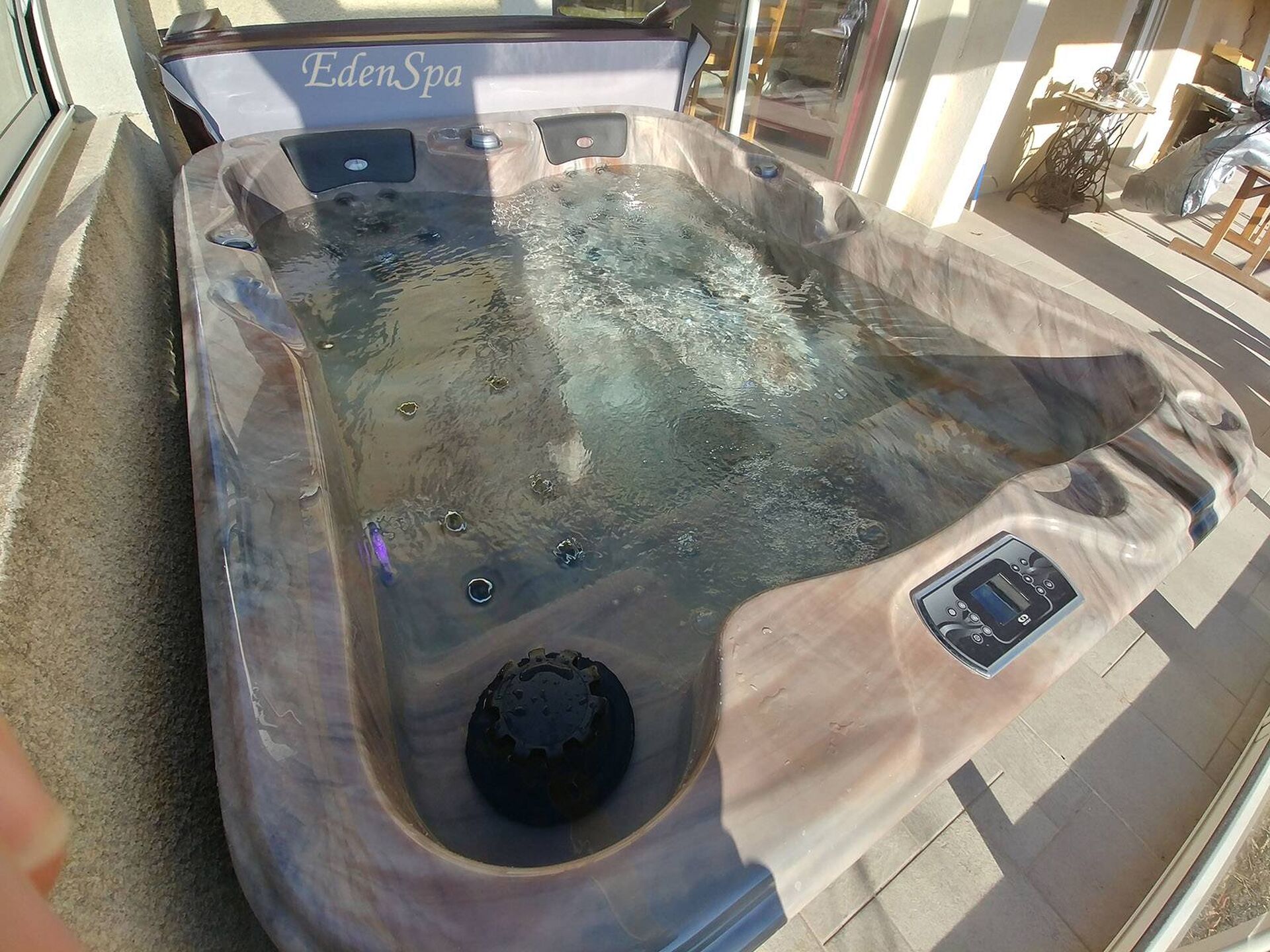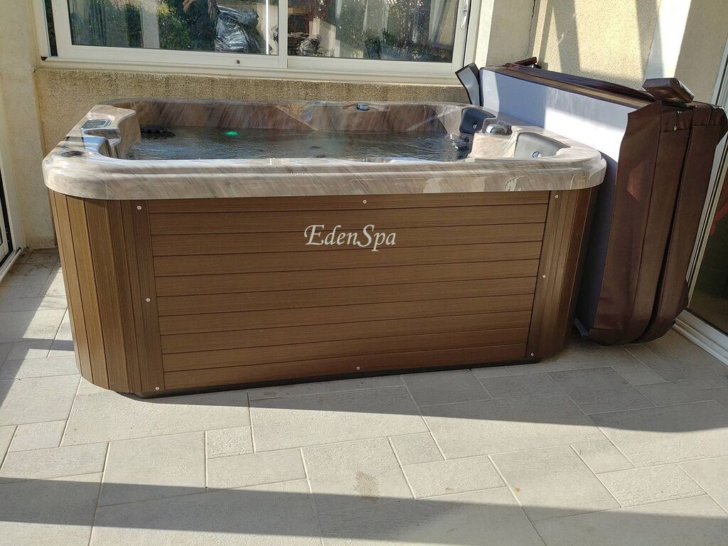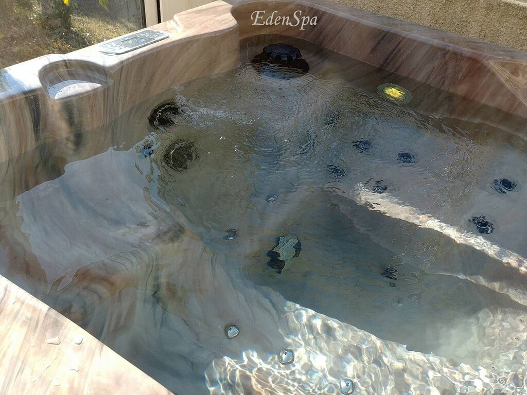 La couleur de ce spa sort un peu de l'ordinaire, les clients ayant choisi une coque Tuscan Sun, très jolie, assortie d'un habillage Mohagany, parfaitement coordonné.