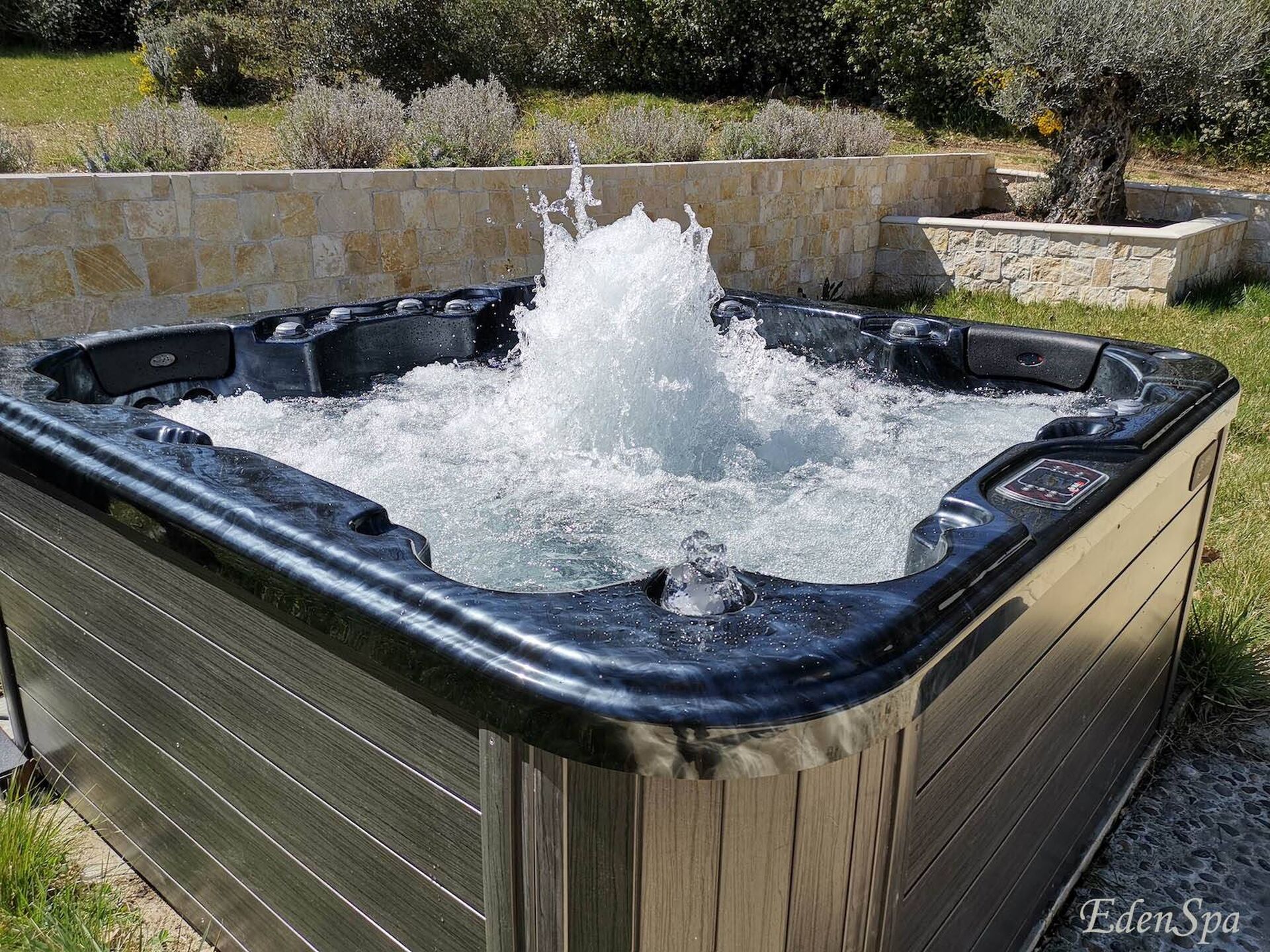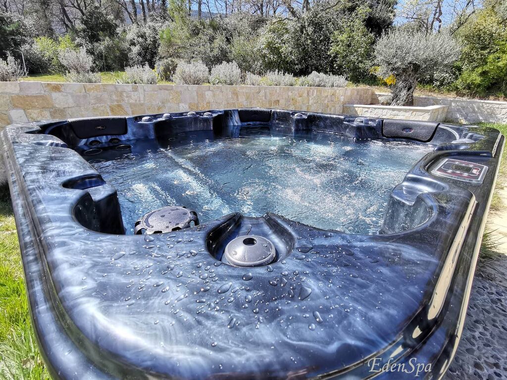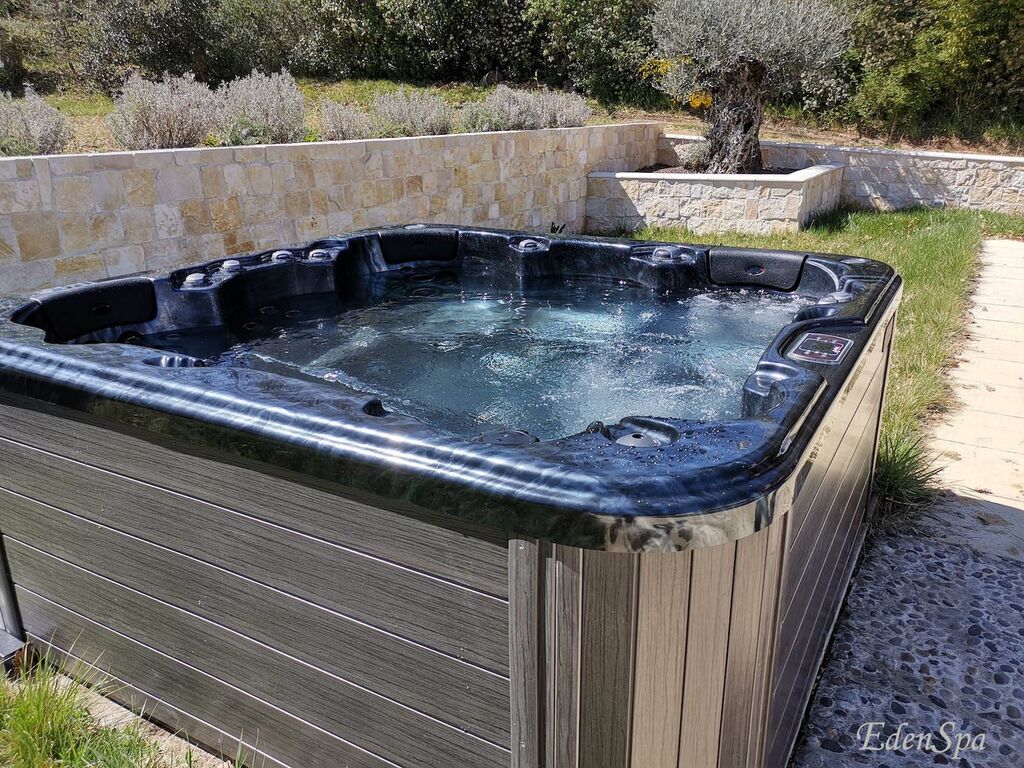 Le spa prend place dans un jardin à proximité de Saint Maximin, au pied d'un mur de style provençal, d'un olivier. La couleur de la coque, Par Shadow associée à un habillage gris, apporte une touche de contemporain sans pour autant dénoter avec le reste du jardin.