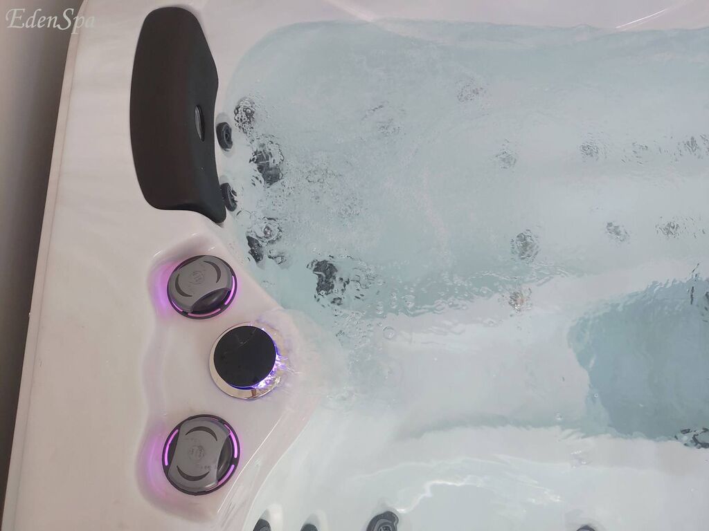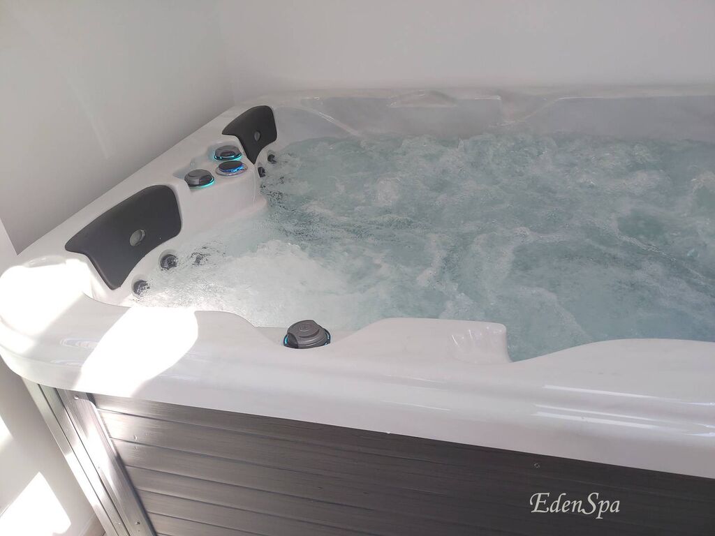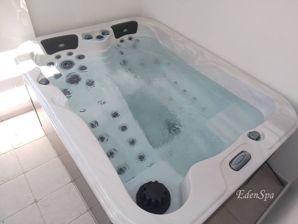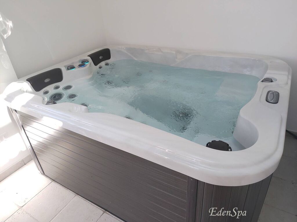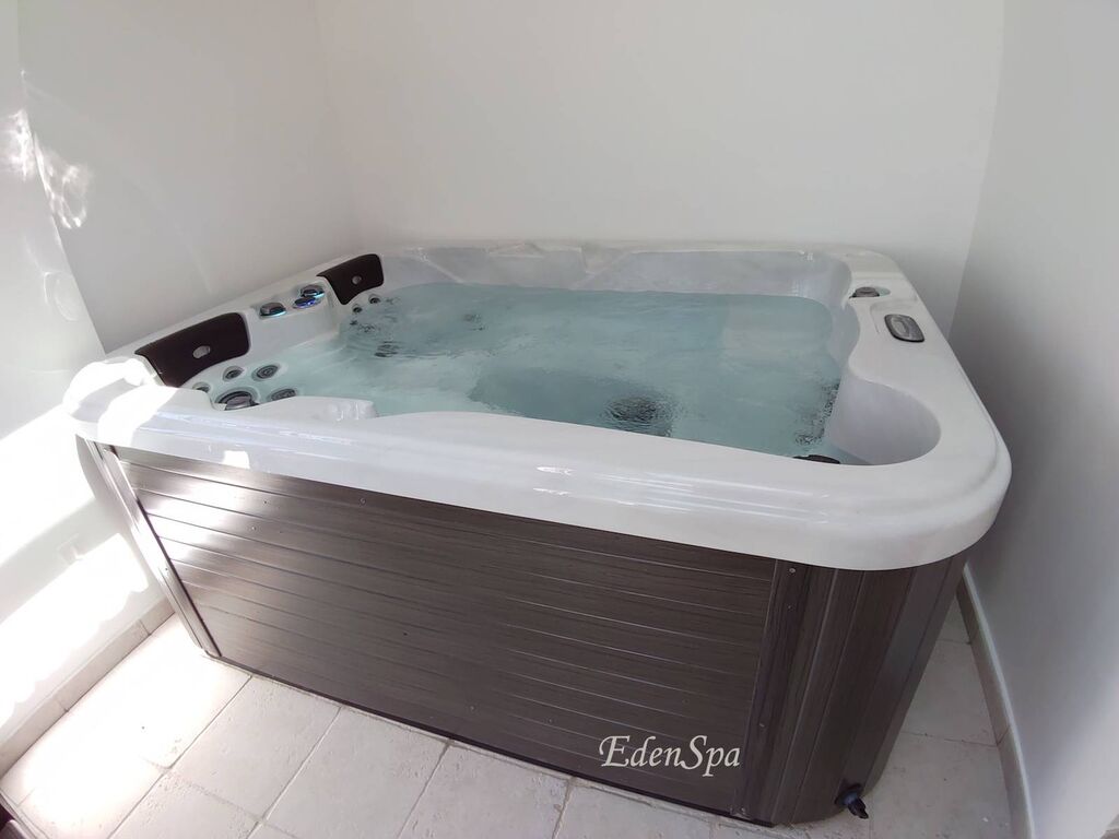 Le modèle choisi est un O354, équipé de 54 jets, de 2 pompes de massage et d'un blower. Les 2 places allongées proposent une ergonomie différente et la place assise permet de voir un verre sans avoir de l'eau jusqu'au cou.