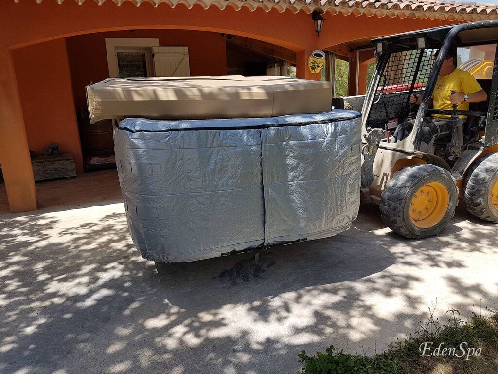 Chose peu commune, nous avons utiliser un engin de type Bobcat pour déplacer le spa jusqu'à son lieu de pose. Grâce à sa motricité, nous avons pu accéder au lieu du chantier sans encombre.