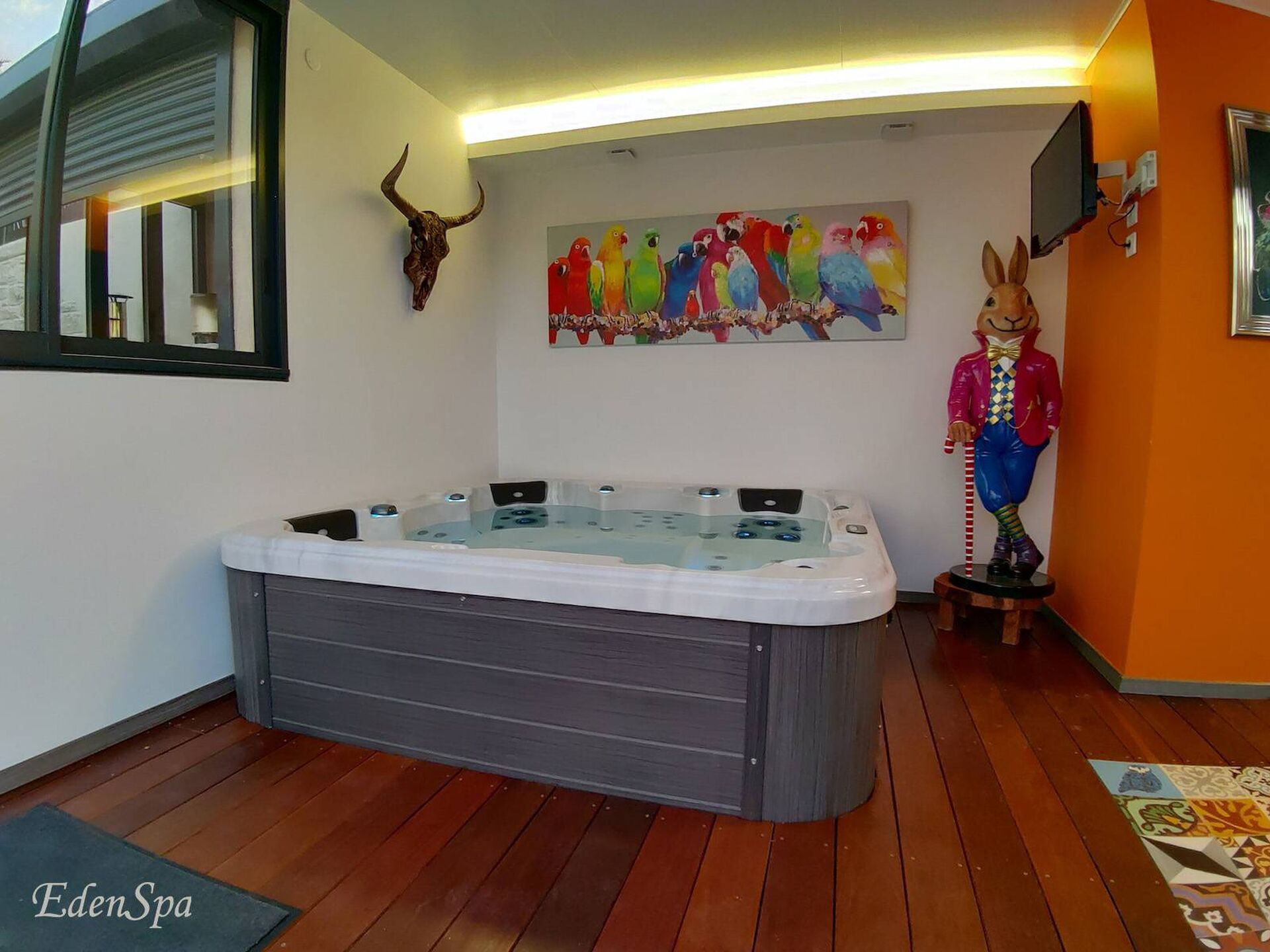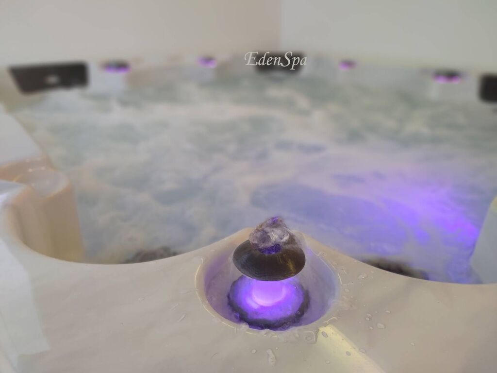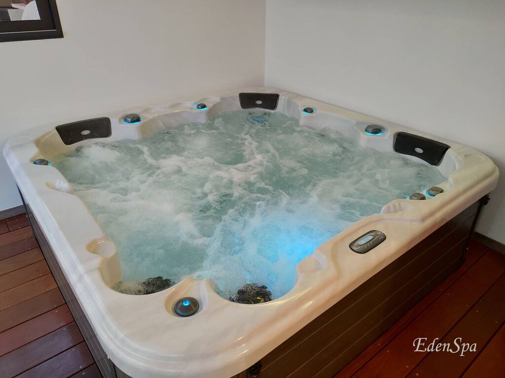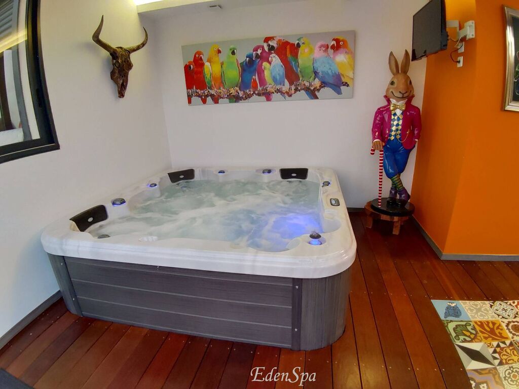 Grâce à la dispositions des places du spa, les baigneurs sont tous orientés vers la pièce, ce qui est plus convivial.
