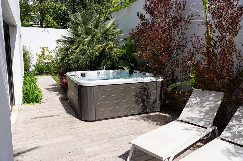 Les palmiers offrent une ombre bienvenue pendant les journées chaudes, tandis que la terrasse en bois crée une ambiance chaleureuse et accueillante. Le spa est situé à proximité immédiate de la terrasse, ce qui permet de profiter facilement des deux espaces pour une détente totale.