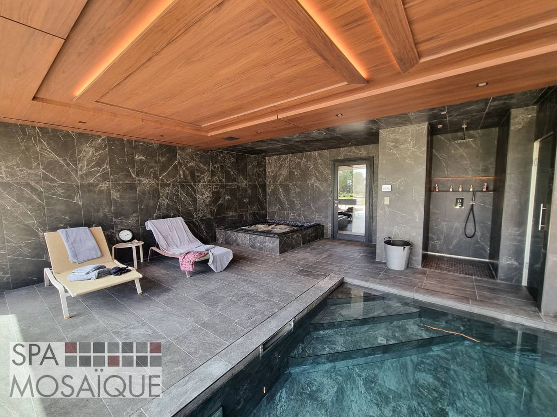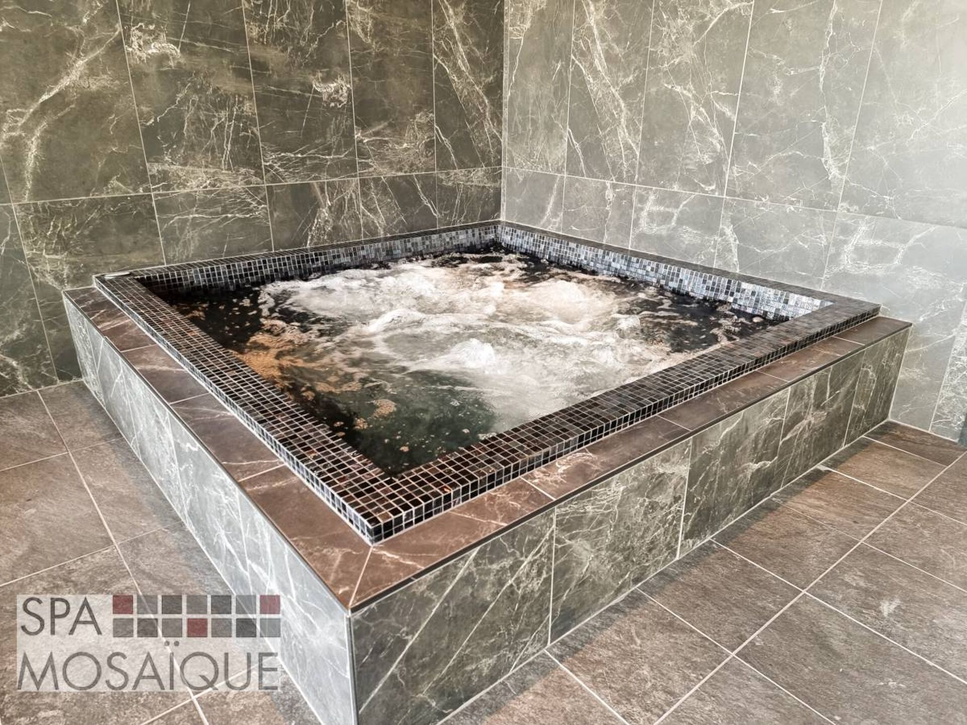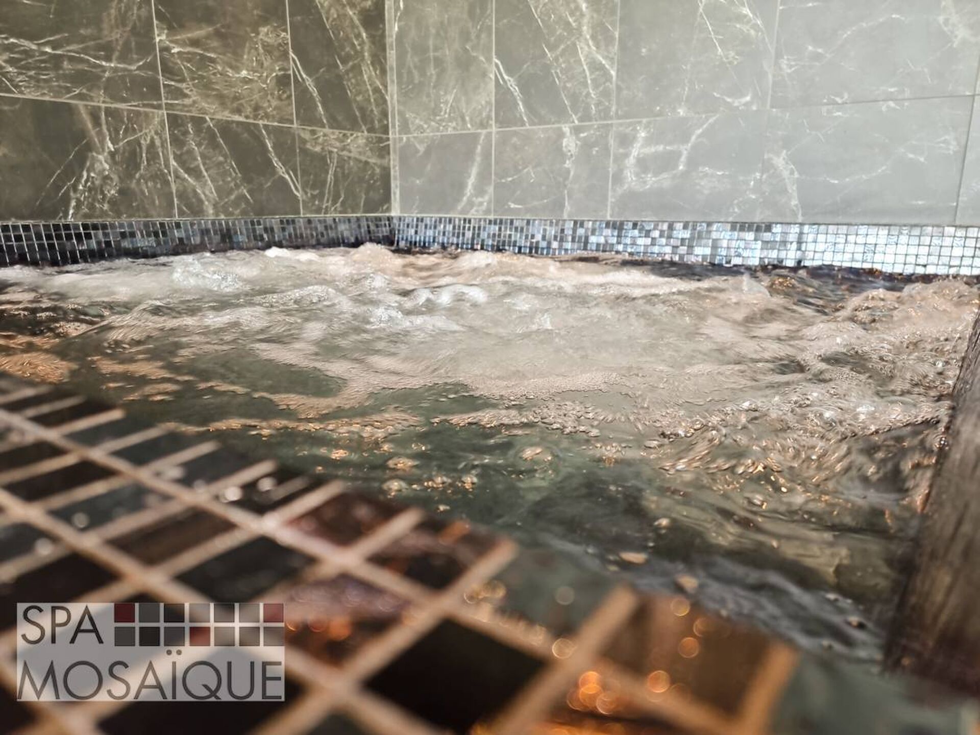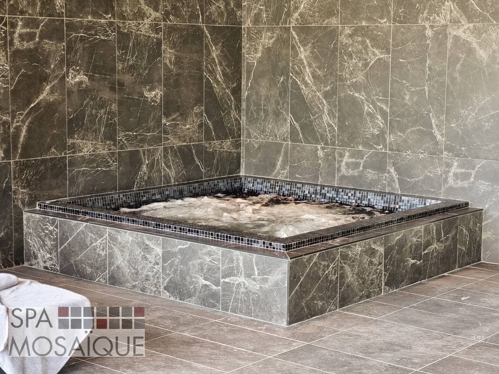 Aujourd'hui, c'est réalisation d'exception que nous avons le plaisir de vous présenter ! Ce spa, directement issu de la gamme Spa Mosaïque est le modèle S200. Celui est la version carré de 200 x 200 cm avec un skimmer. Une version à débordement existe également. Ce spa prend place dans une extension de la demeure, entièrement dédiée au bien-être avec une piscine et un hammam. Il faut préciser que le client a tenu à ce que nous utilisions le même carrelage que dans le hammam, une demande que nous avons bien sûr respecté. Ce modèle est un classique des spas carrelés encastrés, dans la grande lignée des spas d'hôtels de luxe. Une large banquette s'étale sur le tour du spa, seul un escalier change de ce design épuré. Au niveau de la motorisation, nous avons proposé à notre client d'utiliser le système de controle Gecko. Le clavier principal permettant de programmer le spa prend place dans le local technique, à l'écart. C'est un petit clavier simplifié permettant d'allumer et d'éteindre les pompes et l'éclairage qui est installé sur le bord du spa, en toute discrétion. Ce sont 2 pompes de massage de la marque Waterway qui offrent un puissant massage pour les baigneurs. Elles sont secondé par un blower Ultra 9000 qui injecte l'air dans des jets spécifiques. Il est également possible de rassembler l'ensemble des équipements sous le spa de manière à éviter l'installation d'un local technique, mais ici le choix du client était différent. Grâce à un système de chauffage de 3000 watts, le spa reste chaud et la disposition des baigneurs. Nous souhaitons à nos clients de profiter pleinement de ces moments magiques dans leur incroyable spa mosaïque !