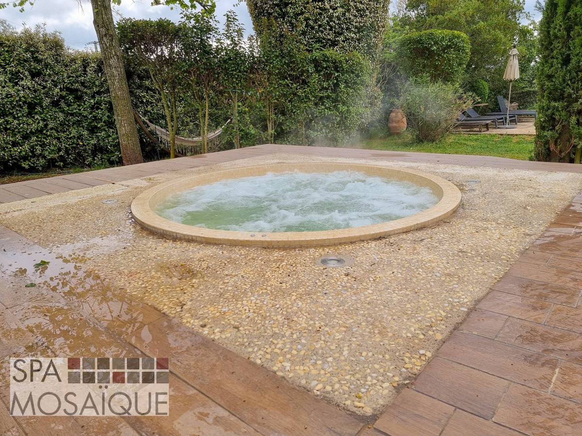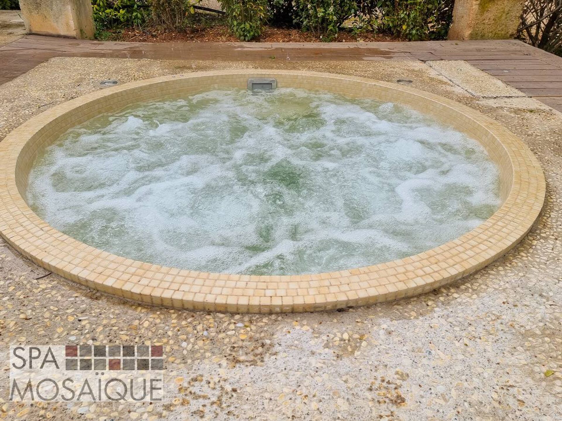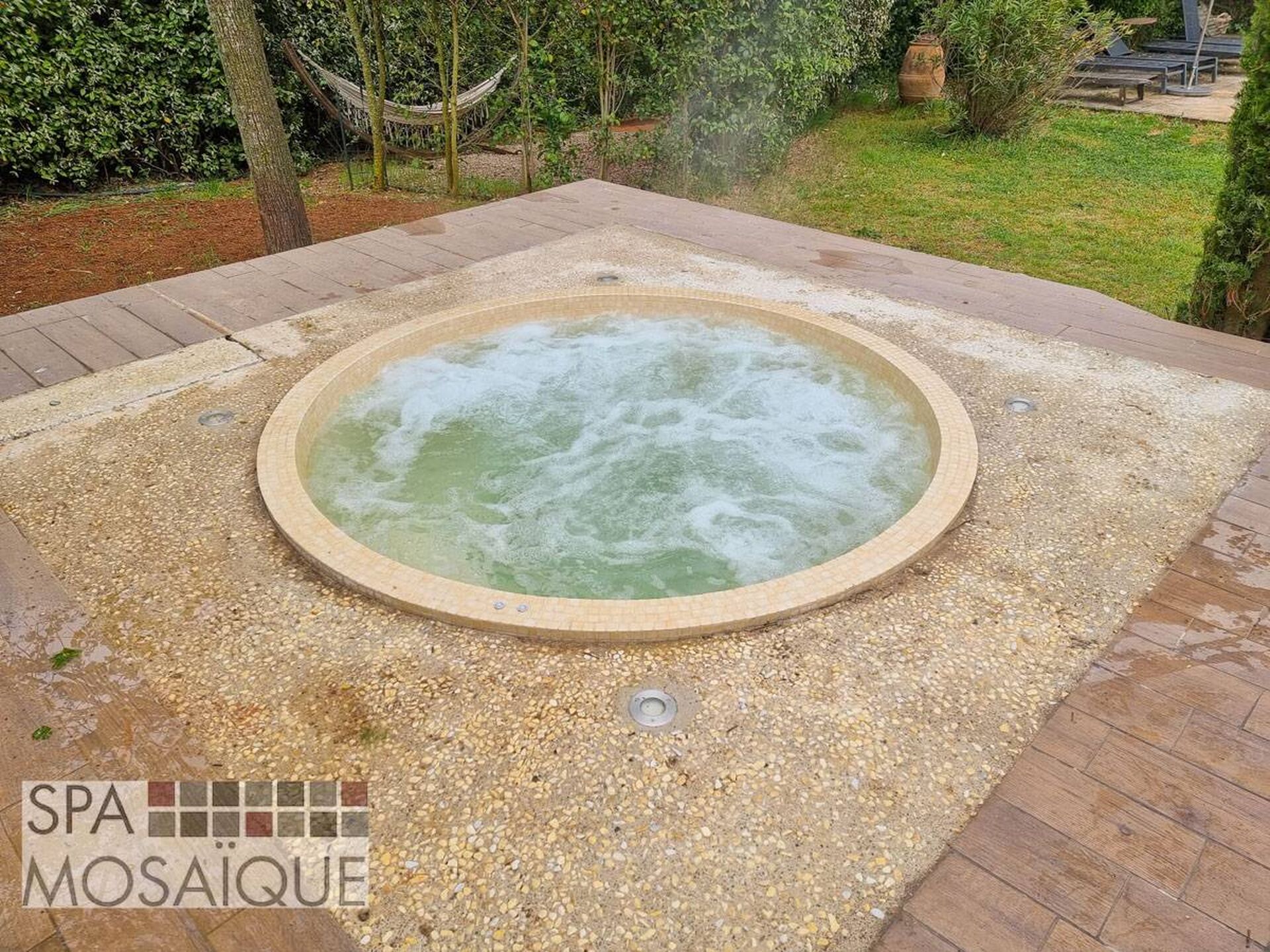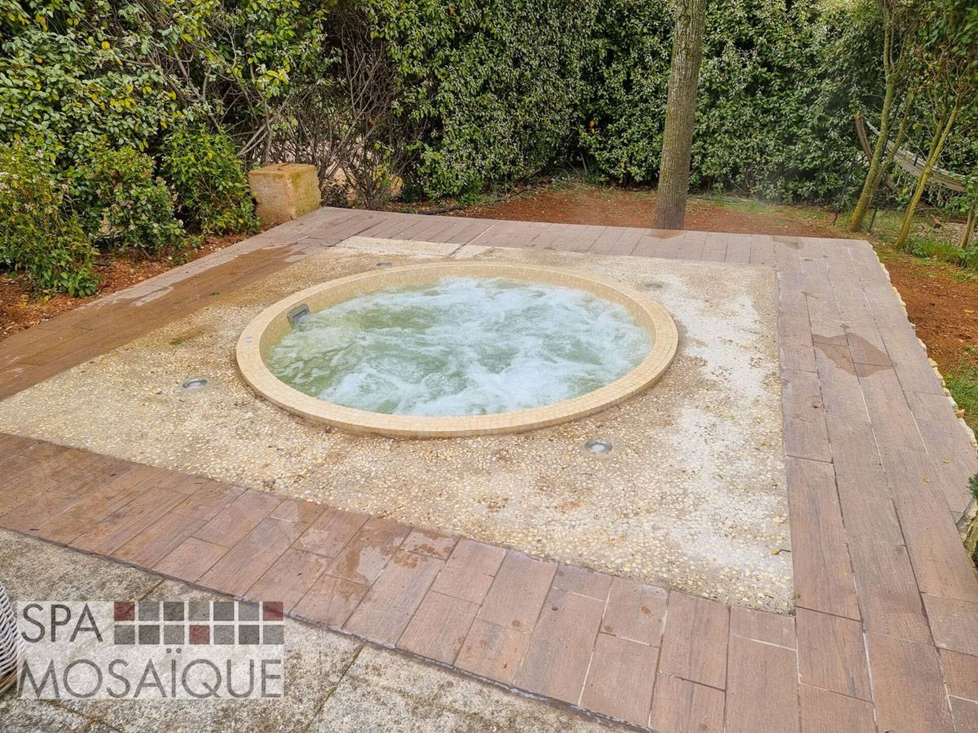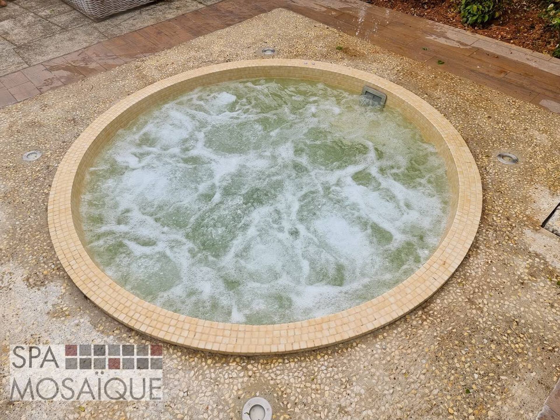 Le spa carrelé est sans aucun doute synonyme de spa luxueux est esthétique. Le spa que nous avons eu le plaisir d'installer est un modèle rond de 220cm de diamètre. Le client a choisi de l'encastrer dans une terrasse en béton carrelé. Grâce à la solution Spa Mosaïque, nous avons pu très simplement lui proposer un spa entièrement fabriqué en usine. Le système particulièrement ingénieux permet d'assembler une coque en fibre de verre sur un châssis en inox. Cette coque sera entièrement isolée grâce à une projection mousse polyuréthane sous la coque. L'intérieur du spa est, quant à lui, carrelé par des artisans carreleurs et jointé directement en usine, ce qui permet d'être dans les meilleures conditions possibles pour que la réalisation soit parfaite. Notre client avait choisi un local déporté, mais il est parfaitement possible d'intégrer la machinerie sous le spa, ainsi le système (spa et machinerie) est entièrement construit et testé en atelier. Le spa ici présent intègre une filtration à sable assurée par une pompe indépendante. La désinfection est faite au brome, tout simplement et le chauffage permet d'utiliser le spa toute l'année. Le spa est adapté pour accueillir 5 à 6 personnes et passer de merveilleux moments en famille ou entre amis !